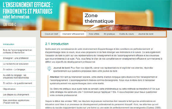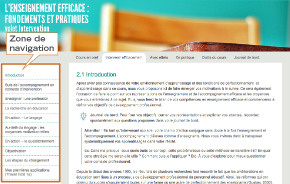 Zone de navigationLa zone de navigation, située à gauche de l’écran, apparaît lorsque vous cliquez sur un onglet de la zone thématique. Voyons ce qui apparaît lorsqu’on clique sur l’onglet « Intervenir efficacement ».
